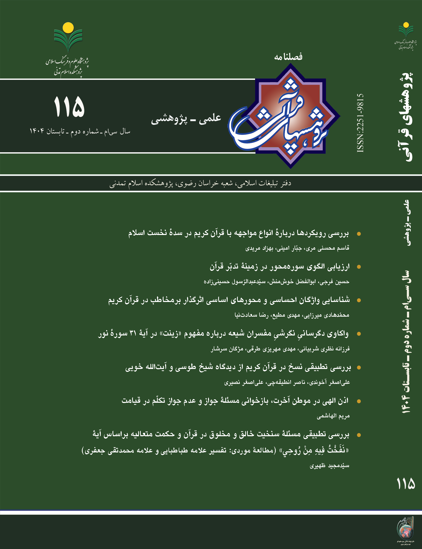 به گزارش پایگاه اطلاعرسانی پژوهشکده اسلام تمدنی، به همت پژوهشکده اسلام تمدنی و اداره نشریات شعبه خراسان رضوی، صد و پانزدهمین شماره از فصلنامه علمی ـ پژوهشی پژوهش های قرآنی مربوط به تابستان ۱۴۰۴ چاپ و منتشر شد و مقالات این شماره بر روی سامانه نشریه به آدرس http://jqr.isca.ac.ir نمایه گردید.